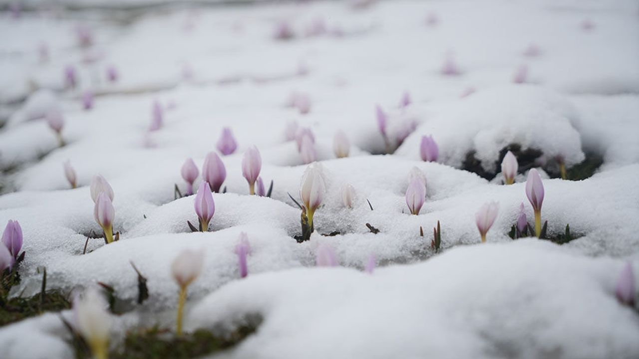 Baharın habercisi çiğdemler kar altında kaldı