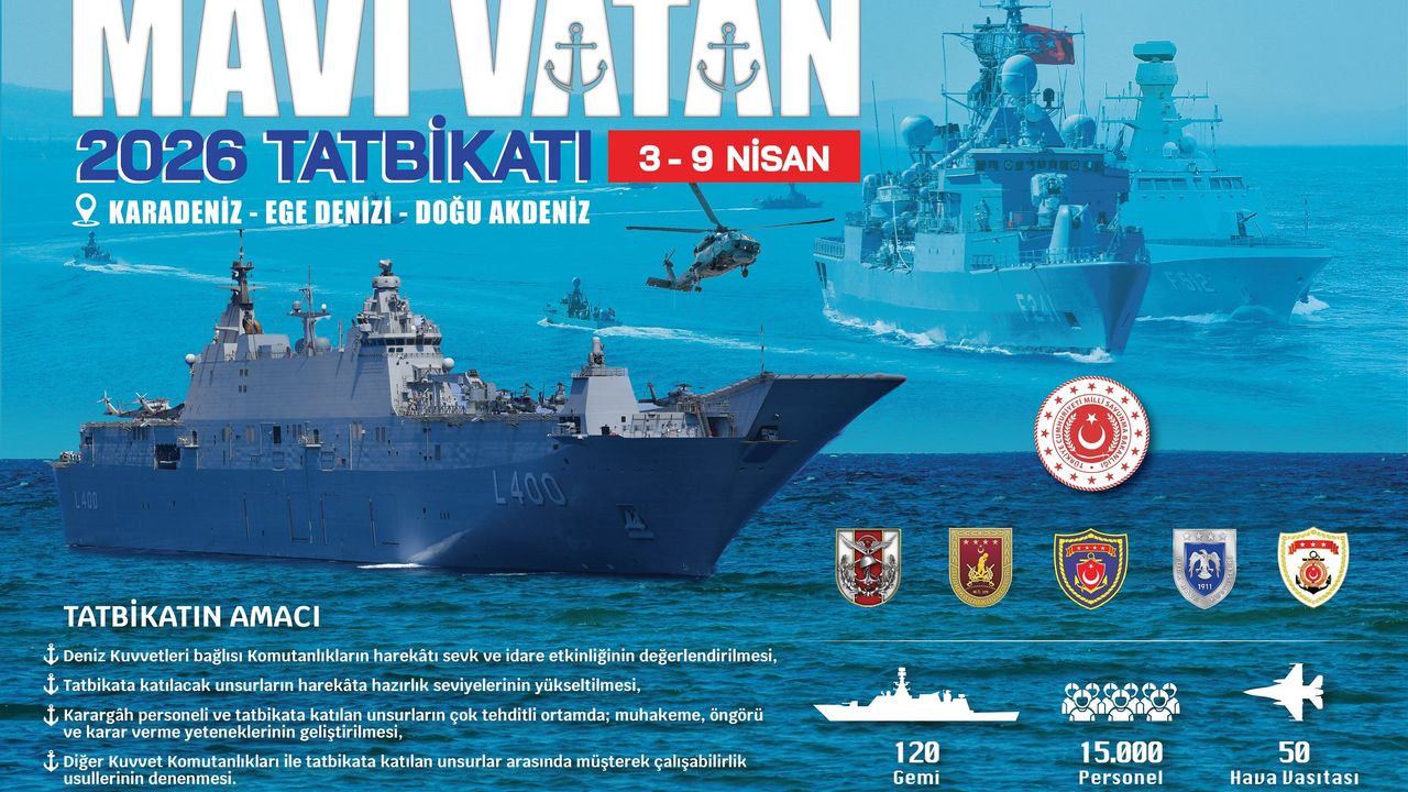 Bakanlığın sanal medya hesabından, ‘3-9 Nisan 2026, Karadeniz-Ege Denizi-Doğu Akdeniz’ başlığı ile yapılan paylaşımda, “Mavi Vatan-26 Tatbikatı; Deniz Kuvvetleri Komutanlığı, Kara Kuvvetleri Komutanlığı, Hava Kuvvetleri Komutanlığı ve Sahil Güvenlik Komutanlığından toplam 120 gemi ve 50 hava vasıtası ile başladı” denildi.